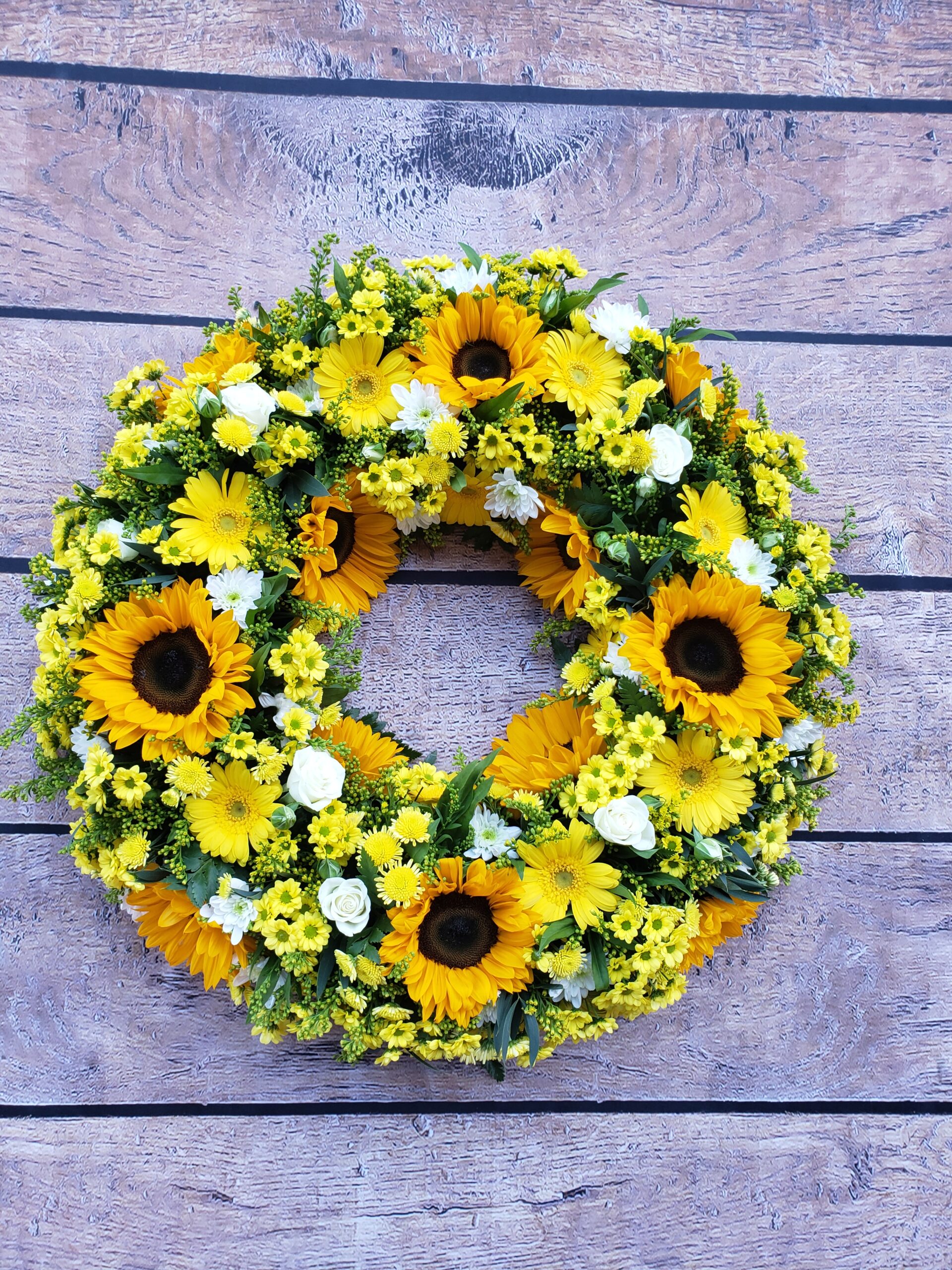 Sunflower Wreath filled with sunflowers and other seasonal yellow flowers.