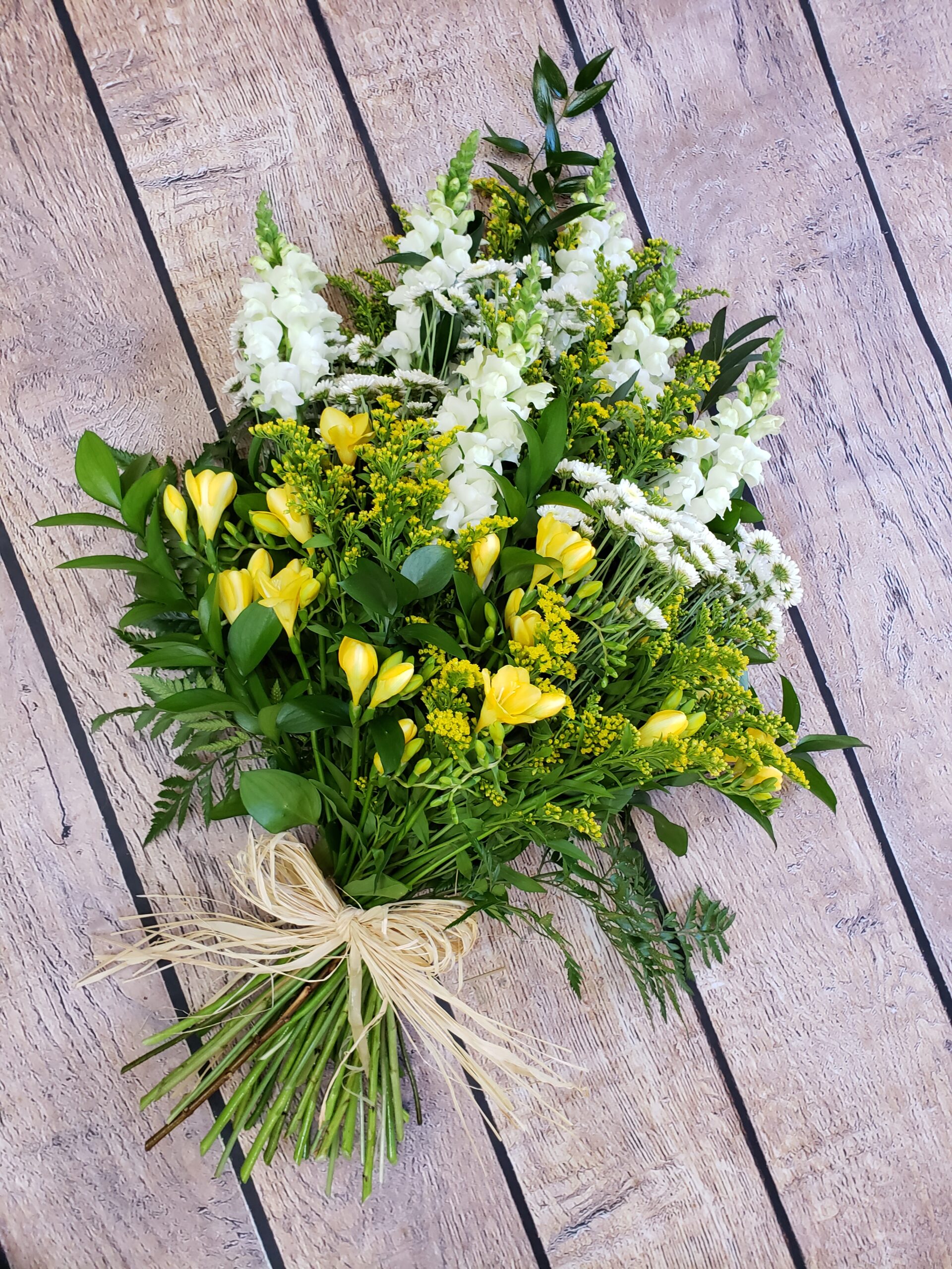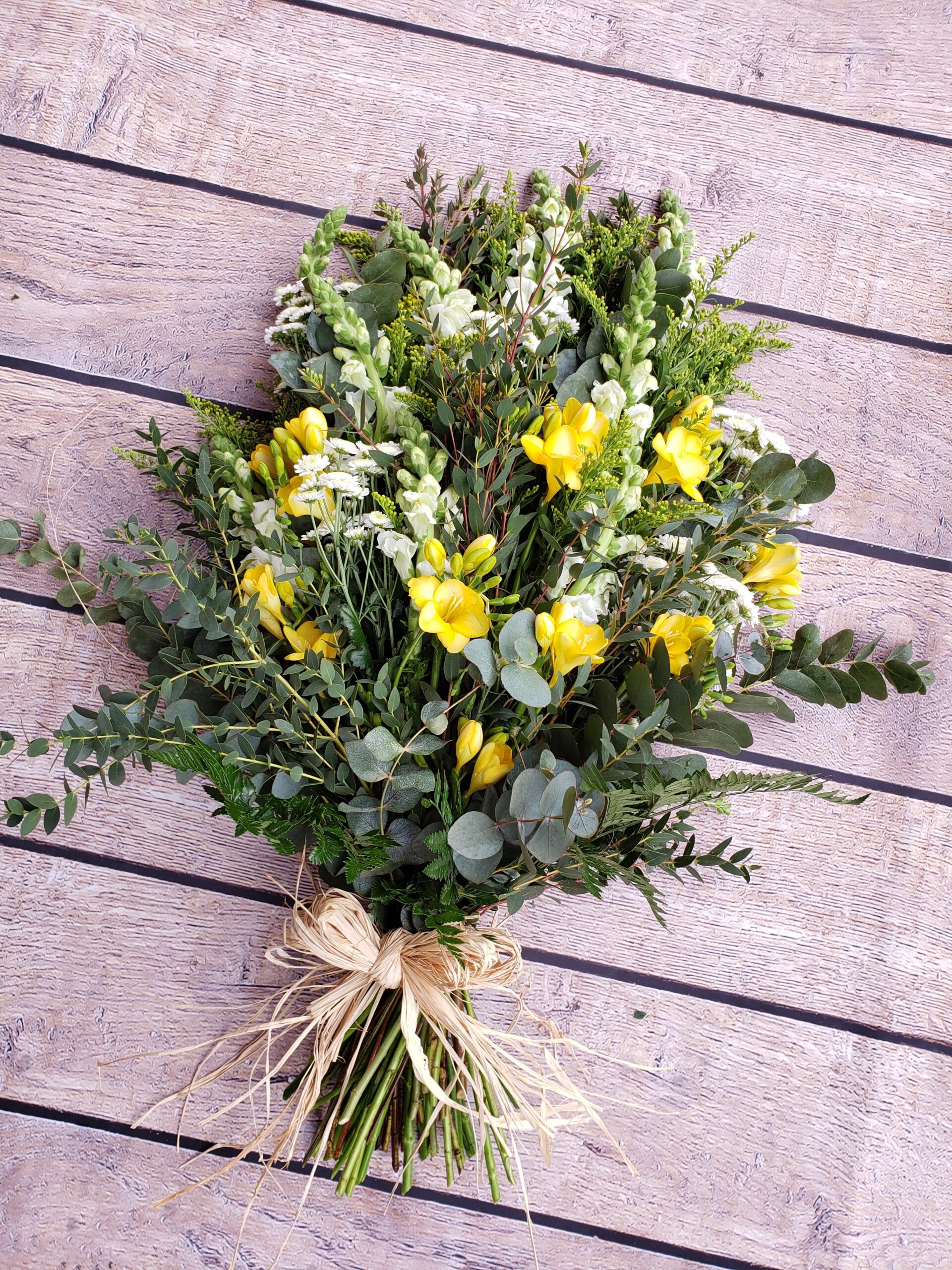Hand tied yellow freesia sheaf and white seasonal flowers tied with natural raffia.